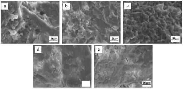 圖 1 不同膨脹劑摻量的預拌補償收縮混凝土微觀形貌(1000×) (a)HCSA:0%; (b)HCSA:4%; (c)HCSA:6%; (d)HCSA:8%; (e)HCSA:10%