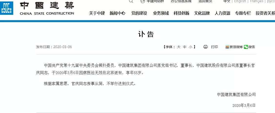 中國(guó)共產(chǎn)黨第十九屆中央委員會(huì)候補(bǔ)委員,中國(guó)建筑集團(tuán)有限公司原黨組書記、董事長(zhǎng),中國(guó)建筑股份有限公司原董事長(zhǎng)官慶同志,于2020年3月6日因病醫(yī)治無(wú)效在北京逝世,享年55歲。
