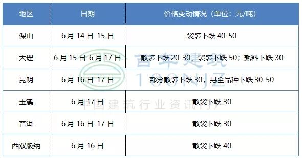 17日云南玉溪、大理地區(qū)部分品牌水泥價格下跌30元/噸,雨水天氣市場需求不佳,價格回落。
