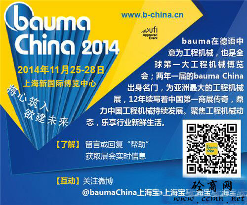 China 2014,11月25-28日行業(yè)翹楚絢麗登陸上海新國際博覽中心,工程機(jī)械行業(yè)產(chǎn)品全面細(xì)分展示??达L(fēng)云變幻,捕行業(yè)動(dòng)向,我們相約bauma China 2014!