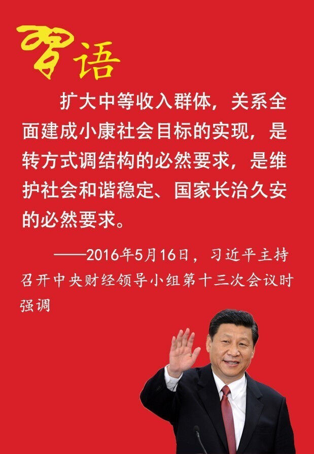 2016年5月16日,習(xí)近平主持召開(kāi)中央財(cái)經(jīng)領(lǐng)導(dǎo)小組第十三次會(huì)議,分別研究落實(shí)供給側(cè)結(jié)構(gòu)性改革、擴(kuò)大中等收入群體工作。他強(qiáng)調(diào)要堅(jiān)持以人民為中心的發(fā)展思想,在全社會(huì)大力弘揚(yáng)勤勞致富、艱苦奮斗精神,激勵(lì)人們通過(guò)勞動(dòng)創(chuàng)造美好生活,不斷提高生活水平。