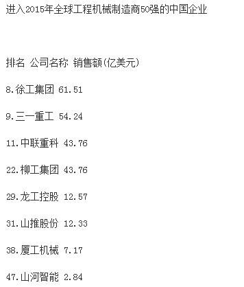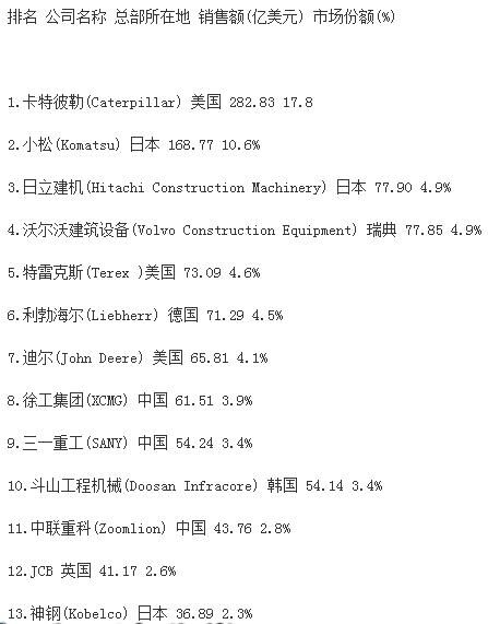 分析指出,受大宗商品價(jià)格下跌、新型經(jīng)濟(jì)體經(jīng)濟(jì)增速減緩和世界經(jīng)濟(jì)不景氣的影響,全球前50家工程機(jī)械制造企業(yè)總產(chǎn)值較上一年度下跌16.2%,達(dá)到1330億美元,創(chuàng)2009年以來(lái)新低。據(jù)中國(guó)工程機(jī)械商貿(mào)網(wǎng)編輯了解,2009年,工程機(jī)械行業(yè)一年銷(xiāo)售額下降了1090億美元。自那時(shí)起,工程機(jī)械行業(yè)收入下降趨勢(shì)一直未有改變。報(bào)告同時(shí)強(qiáng)調(diào),榜單上下滑最為嚴(yán)重的是中國(guó)企業(yè),這很大程度上是因?yàn)橹袊?guó)經(jīng)濟(jì)增速的放緩。中國(guó)企業(yè)中,只有徐工集團(tuán)仍然保持在前十強(qiáng),位列榜單第九位。“這個(gè)市場(chǎng)趨勢(shì)表現(xiàn)最顯著的就是中國(guó)建筑設(shè)備制造商,相比去年,所有中國(guó)企業(yè)的排名有所下滑。排名前十的企業(yè)中,如今只有徐工一家中國(guó)工程機(jī)械制造廠(chǎng)商?!?/span>