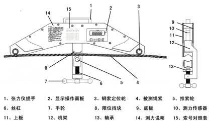 按鍵從左至右依次為“ON/OFF”、“+”、“-”、“ENTER/ZERO”;上部LCD顯示的五位數(shù)字為索拉力,單位為、旋緊手輪至鋼索頂?shù)较尬患达@示鋼索拉力