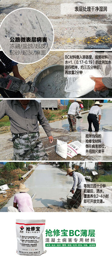 搶修寶BC薄層修補(bǔ)材料,可實(shí)現(xiàn)3毫米以上的超薄層快速修補(bǔ),美觀度高,而且具有防凍和抗腐蝕性能。農(nóng)村公路的起砂病害用搶修寶BC薄層修補(bǔ)材料進(jìn)行修補(bǔ),受到了甲方及施工單位的認(rèn)可,并且建立長(zhǎng)期合作。