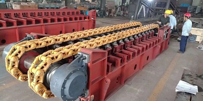 由于板喂機(jī)是通過(guò)鏈輪、鏈條、鏈板、傳動(dòng)等一系列全鋼結(jié)構(gòu)的剛性機(jī)架將物料拖出庫(kù)底的。所有的料倉(cāng)壓力由板式給料機(jī)承擔(dān),避免的由于料倉(cāng)壓力過(guò)大把皮帶秤壓壞現(xiàn)象。